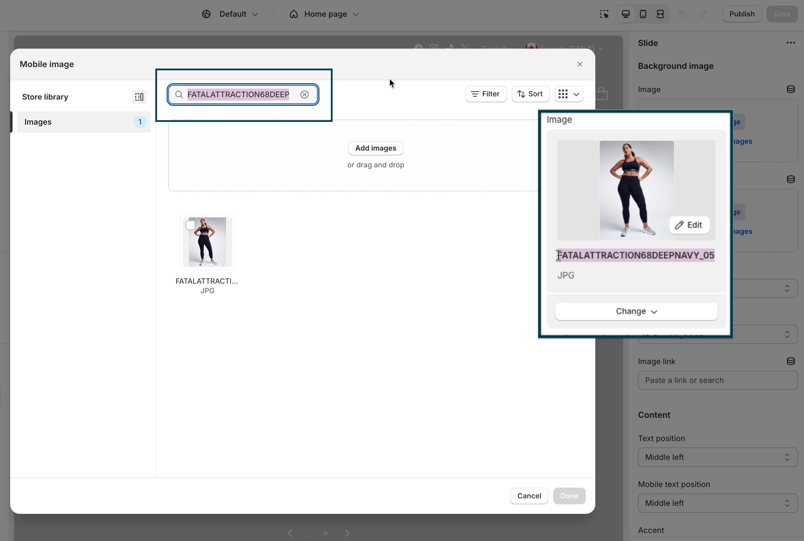 * **Search file names** You can copy the name of the image file from your old theme and paste it into the search bar. This will save you time from scrolling through your entire media library.
