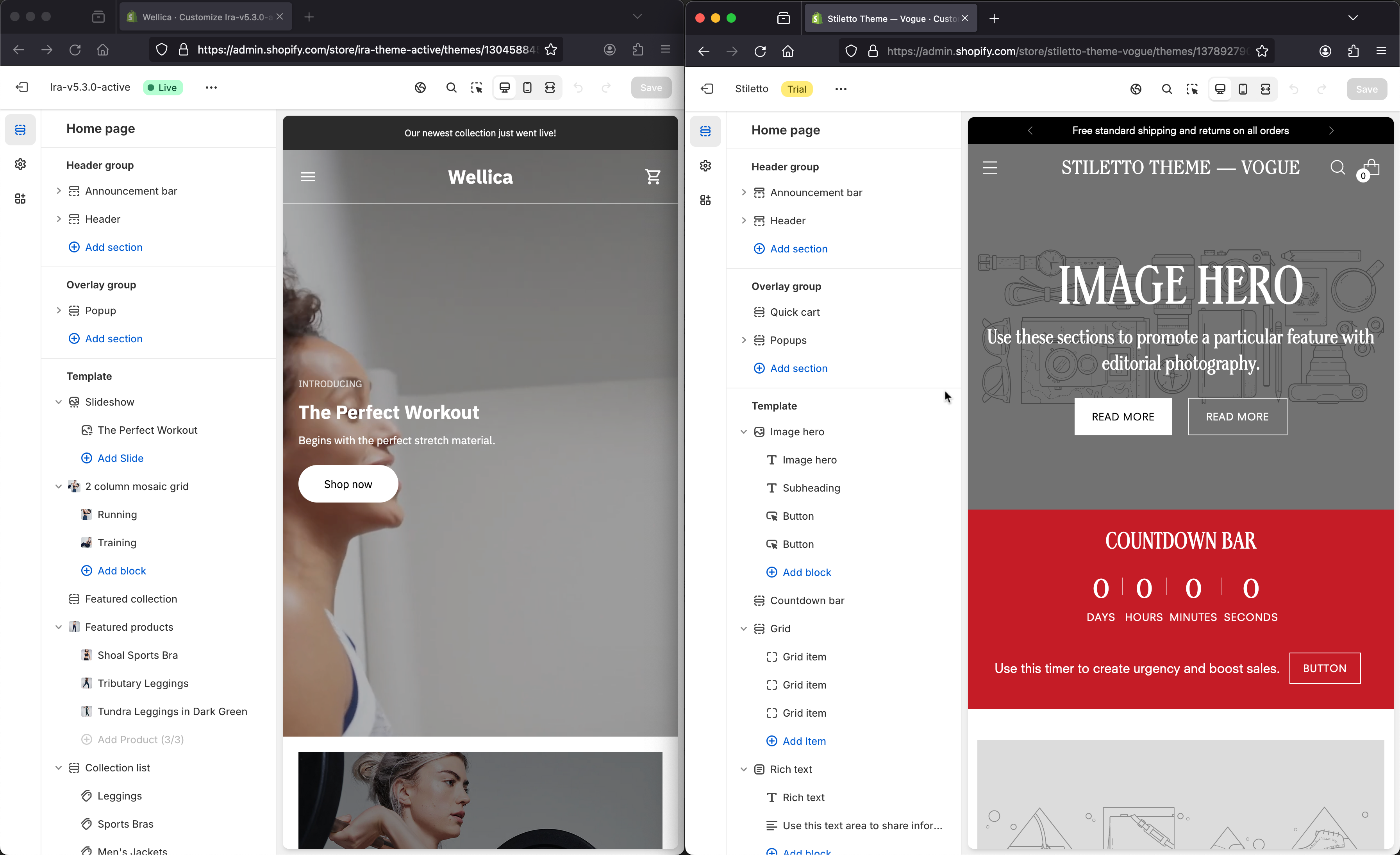 <table data-card-size="large" data-view="cards"><thead><tr><th></th><th></th><th data-hidden></th><th data-hidden data-card-cover data-type="files"></th></tr></thead><tbody><tr><td><strong>Open both theme editors</strong></td><td>Open your old and new theme in two separate windows side-by-side.</td><td></td><td><a href="https://1721436993-files.gitbook.io/~/files/v0/b/gitbook-x-prod.appspot.com/o/spaces%2F3iiuvh8UrcOxEOQkY2iO%2Fuploads%2Fgit-blob-76a36c67e08718cc09a6c6546bf358d6acab9604%2Ftheme-editor-windows.png?alt=media">theme-editor-windows.png</a></td></tr><tr><td><strong>Use preview inspector</strong></td><td>Enable the inspector to easily select, edit, and add sections. You can also move, duplicate, and hide sections. <a href="https://help.shopify.com/en/manual/online-store/themes/customizing-themes/edit#preview-inspector">Learn more</a>.</td><td></td><td><a href="https://1721436993-files.gitbook.io/~/files/v0/b/gitbook-x-prod.appspot.com/o/spaces%2F3iiuvh8UrcOxEOQkY2iO%2Fuploads%2Fgit-blob-c165e44627db3df7387e7fc82d866924a0ebfceb%2Fpreview-inspector.png?alt=media">preview-inspector.png</a></td></tr></tbody></table>