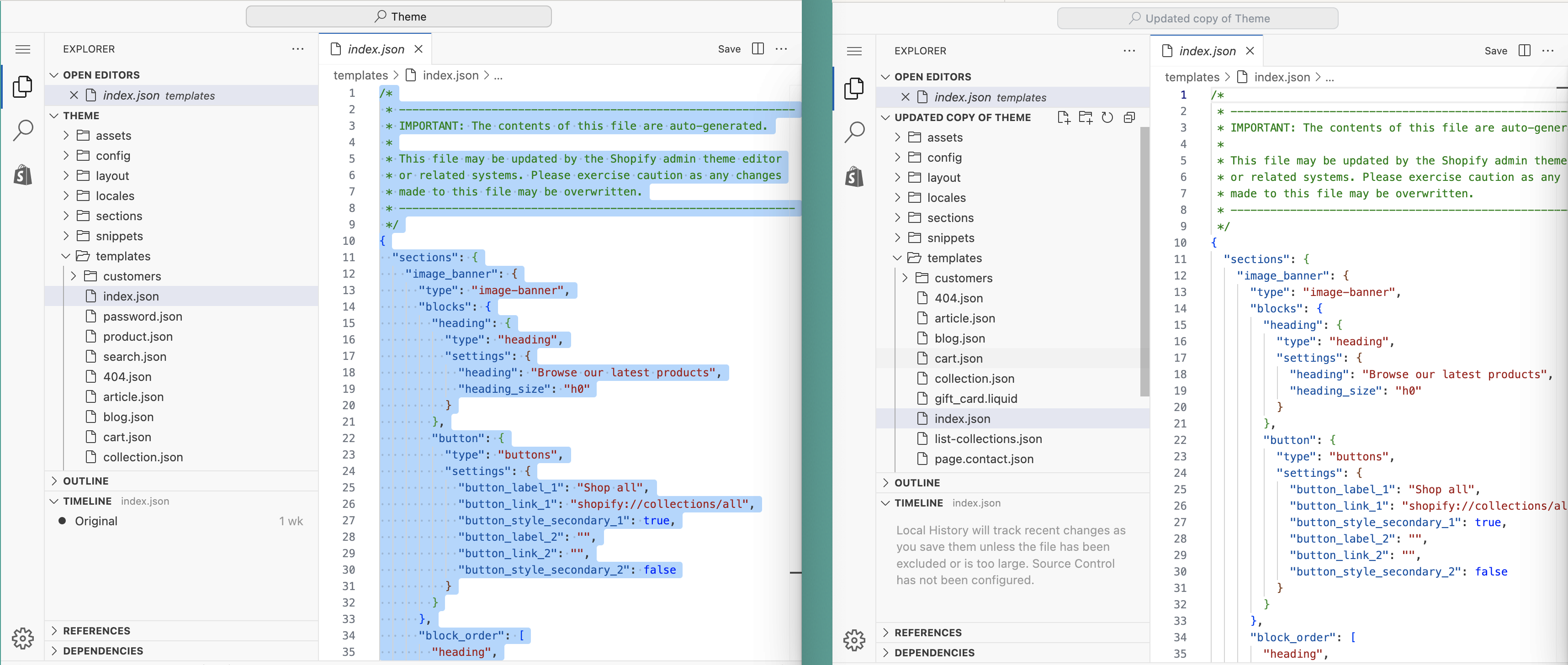 1. In both windows, select the first tab with the same filename (eg. **`blog.json`**)