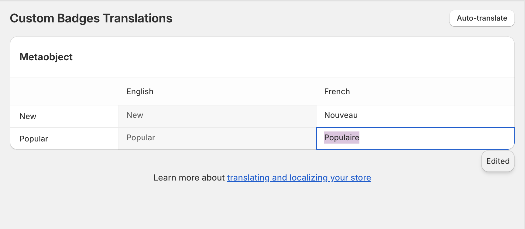 You can use **Metaobjects** and Shopify's [Translate & Adapt](https://apps.shopify.com/translate-and-adapt) app to translate custom badge labels. There are three general steps: